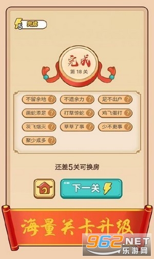 1、闯关答题模式,海量关卡随机出现成千上万的成语,点击屏幕填充成语。