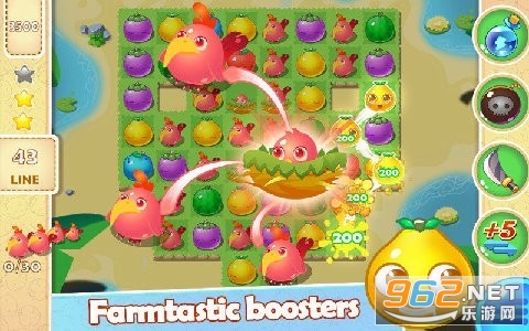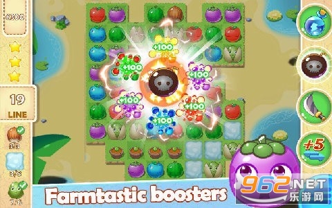 一款画面清新可爱,效果炫酷多彩的休闲益智类游戏。在这个小小的农场里,通过收集各种各样的水果作物,挑战重重关卡,体验不一样的快乐。连接三个或更多相同的水果即可得分。连线越长得分越高,超过一定数量产生超级魔法。超级元素和技能引爆快感。快来吧,加入这个疯狂的水果爆破派对。