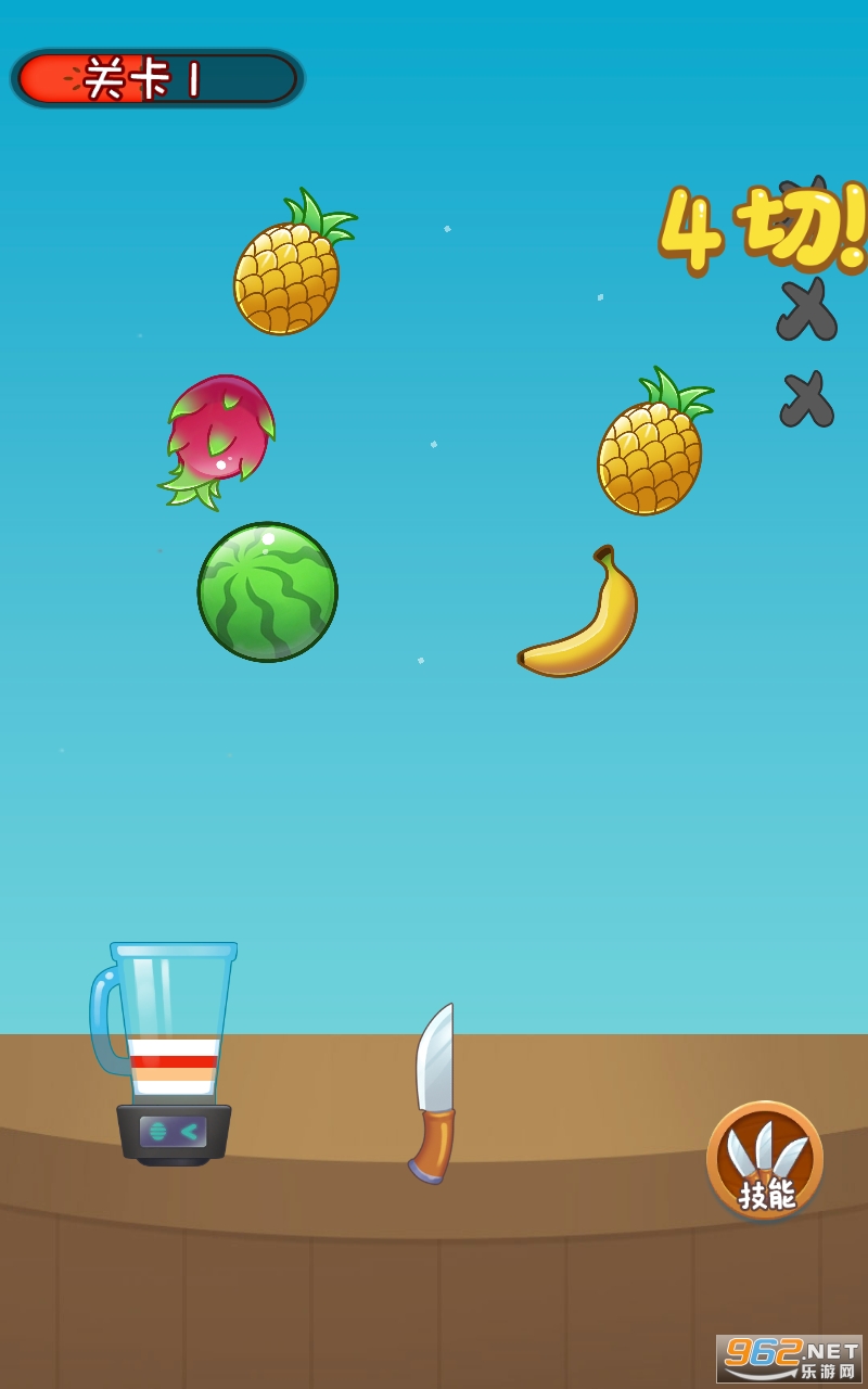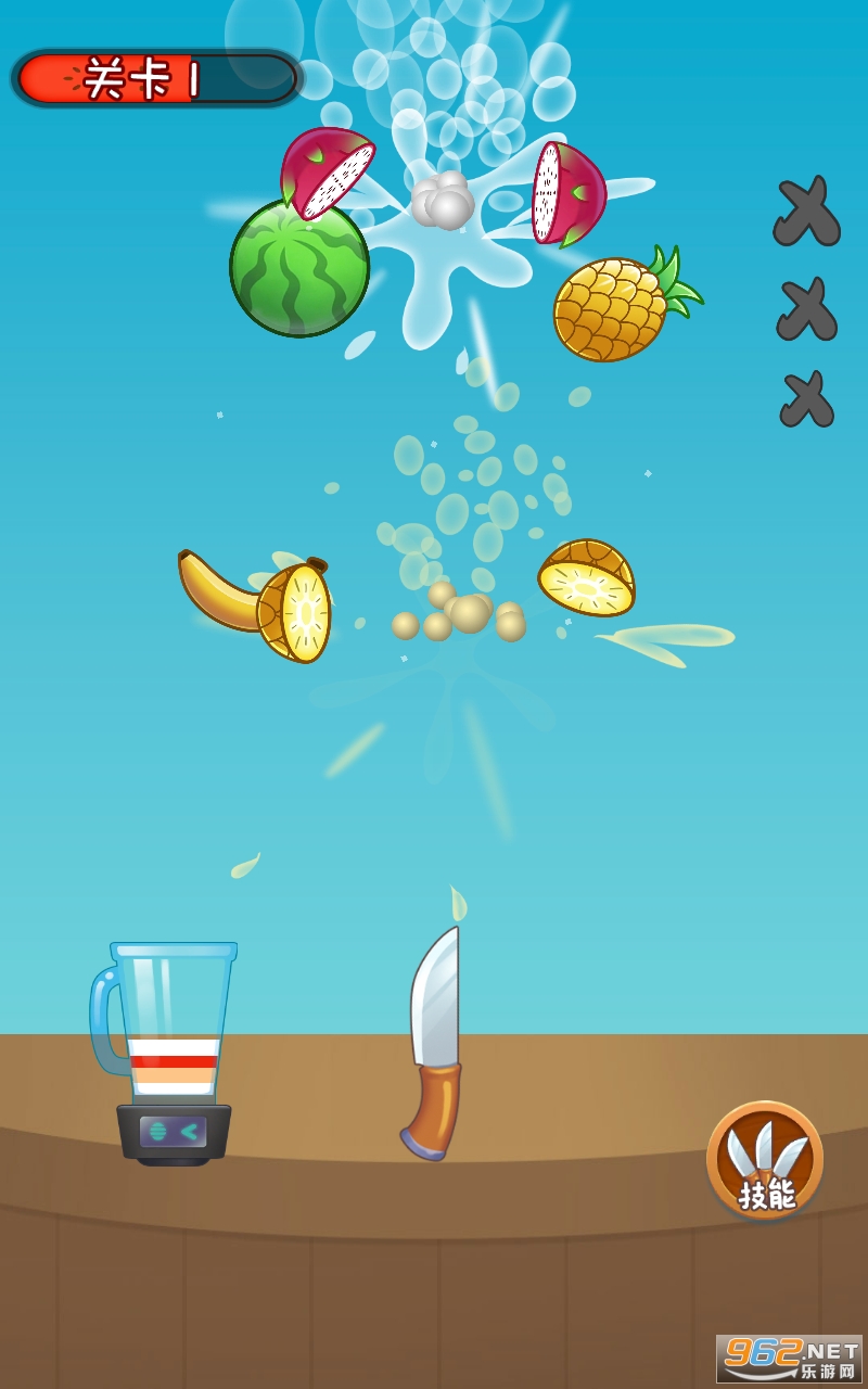 2、发射飞刀切割梨子、苹果等各种水果,在有限的次数内全部切割完,有着丰富的关卡可以挑战。