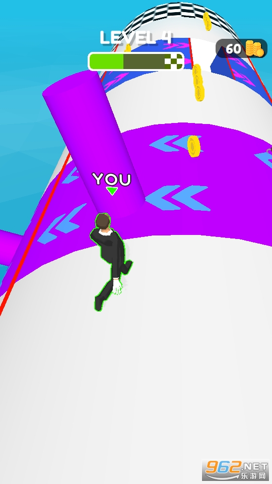 在空中展开竞赛,成为人群中的胜利者,以最快的速度通过关卡的挑战就可以了,赛道设计的非常有创意且危险,尽量的远离红线并且收集金币闯关吧!