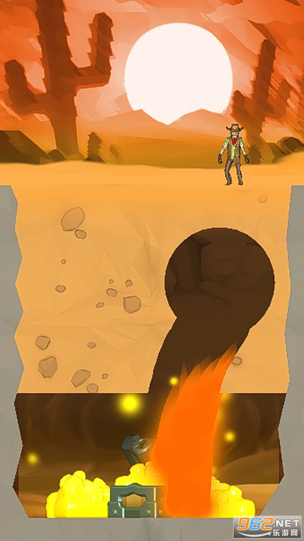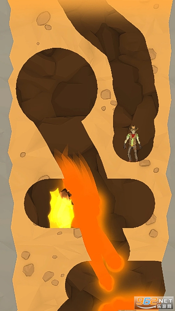 在这款挖宝闯关游戏中,玩家的手指就是铲子,可以在里面尽情挖宝,挖出一条条安全的通道出来,引导冒险牛仔找到宝藏,有时候我们还需要避开熔岩,或者将敌人引诱到熔岩处,非常考验智商的一款挖宝解谜游戏。