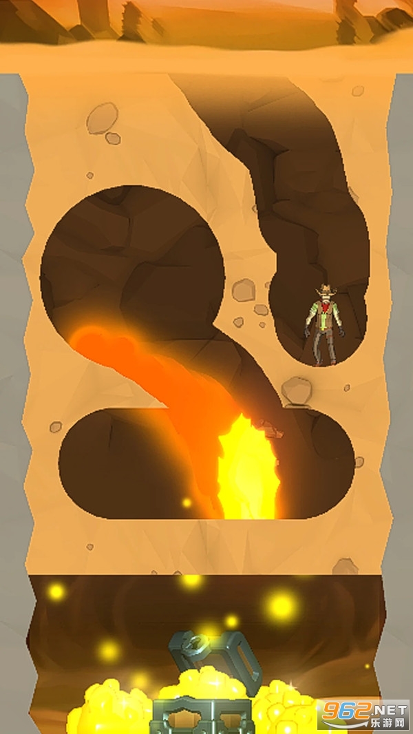 《深挖宝藏》是一款设计非常简单的挖宝闯关游戏,整体的闯关思路是这样的,我们需要挖出一条通道出来,可以成功到达宝藏的位置,千万要小心不要让熔岩漏出来,导致冒险者掉入熔岩中,游戏的趣味性很强,玩起来也很烧脑。