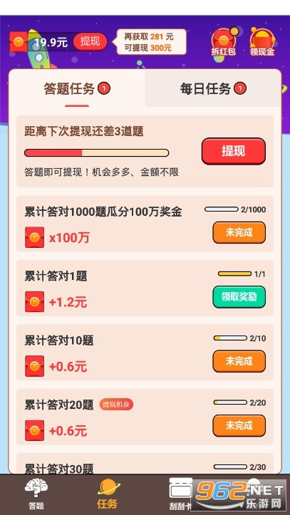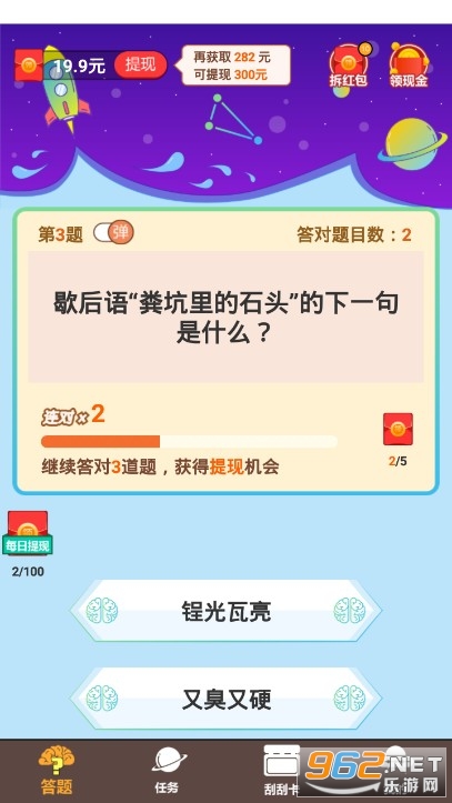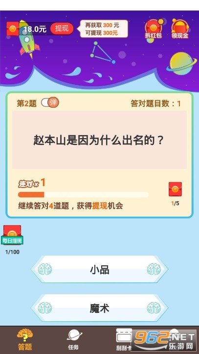 一款充满着智慧的休闲类游戏,当我们来到游戏中的时候,便要开始答题了,里面有着超多的题目,以及各种类型题型,不管是数理化还是什么,玩家全都得会,不会答没答对都会有红包奖励。