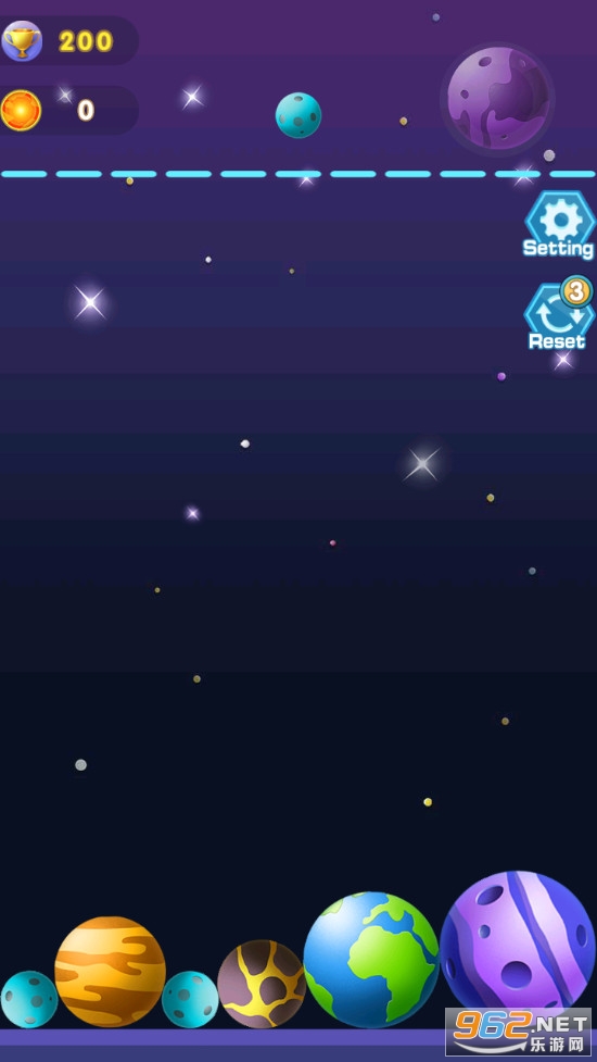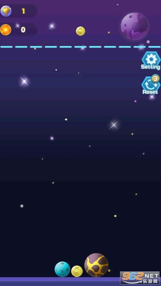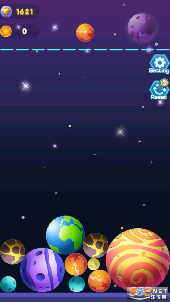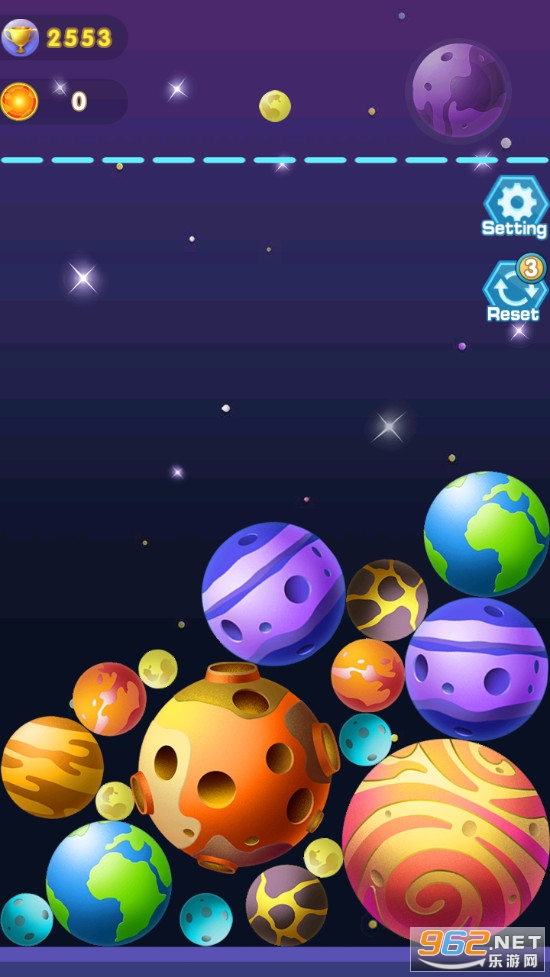 趣味的星球合并游戏,游戏玩法简单,类似2048的玩法,两个相同的星球合并获得一个更大的新的星球,不断合并,获得更高的积分,直到星球触顶,喜欢的朋友可以下载试试。