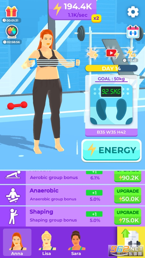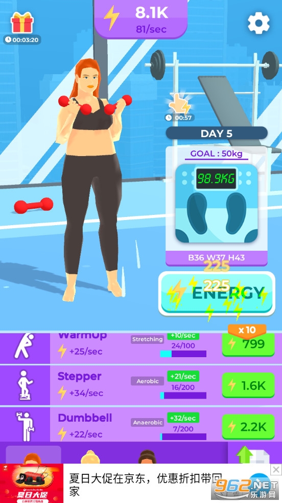 趣味的放置游戏,有着哑铃、跑步机等各种各样的健身器材可以解锁,让女孩做各种运动来减点身上的赘肉,获得苗条的身材,有着多种不同的角色可以解锁,喜欢的朋友可以下载试试。