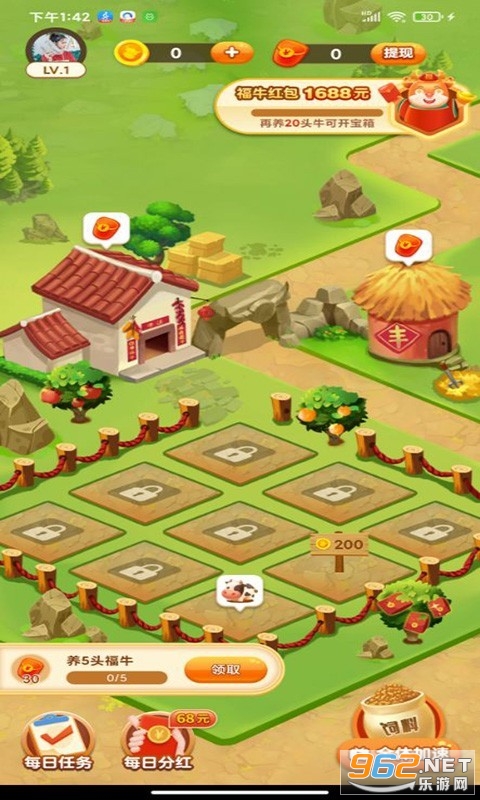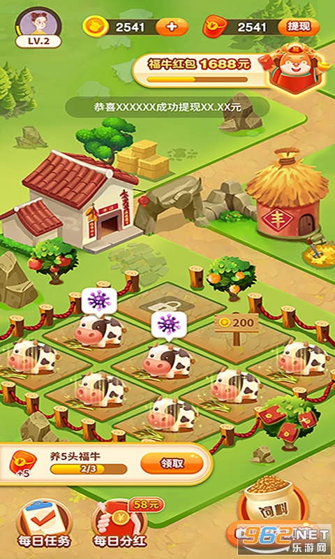 一款养成小游戏,玩家能通过养牛方式获得收获,每养一只牛等于0.3元,集齐牛年福卡,还能领取一路发发红包。养牛过程中,可通过金币加速养成,还需要帮牛消灭病菌。