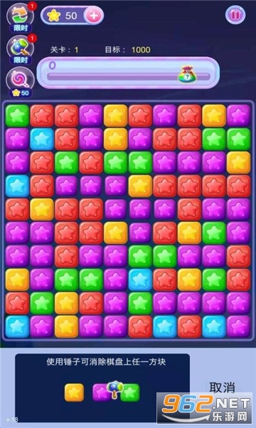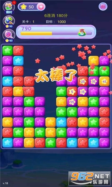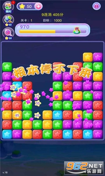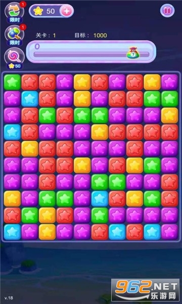 一款非常经典的休闲消除闯关游戏。各种不同颜色的星星方块堆积在了一起,看似杂乱无章,实则内含玄机,想尽办法让尽可能多的相同颜色的星星方块连在一起消除,就能够一次性获得更多的分数哦,每一个关卡都有目标分数,只有达到了才能顺利进入下一个关卡哦。