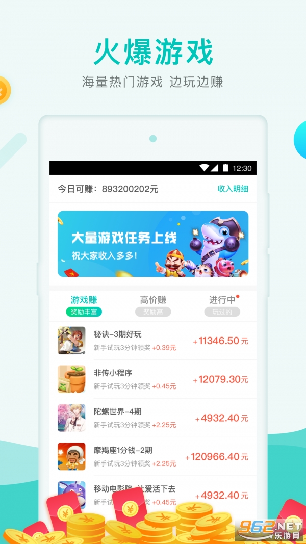 一款完美的试玩赚钱平台,海量的小游戏等你来体验,红包多多,奖励多多,福利也不错,喜欢的朋友快来体验一下试试吧!