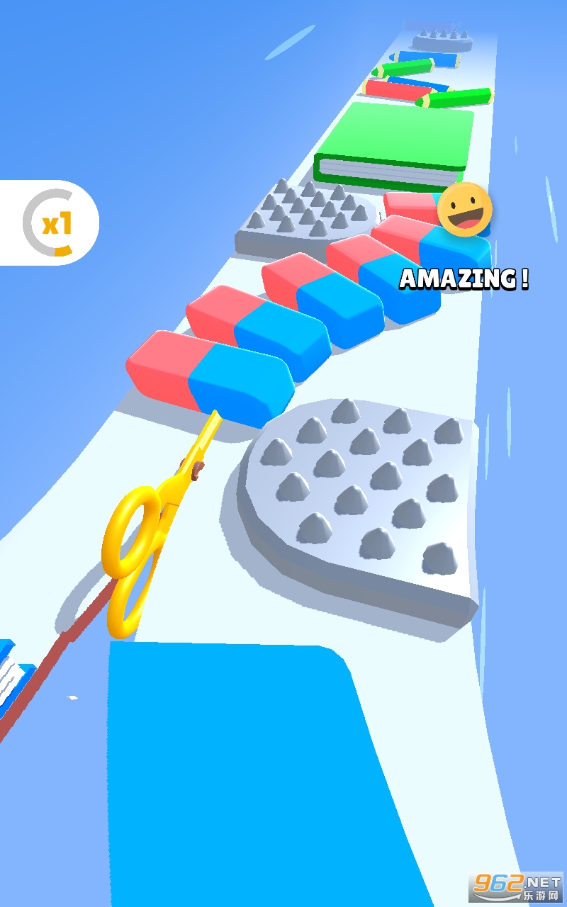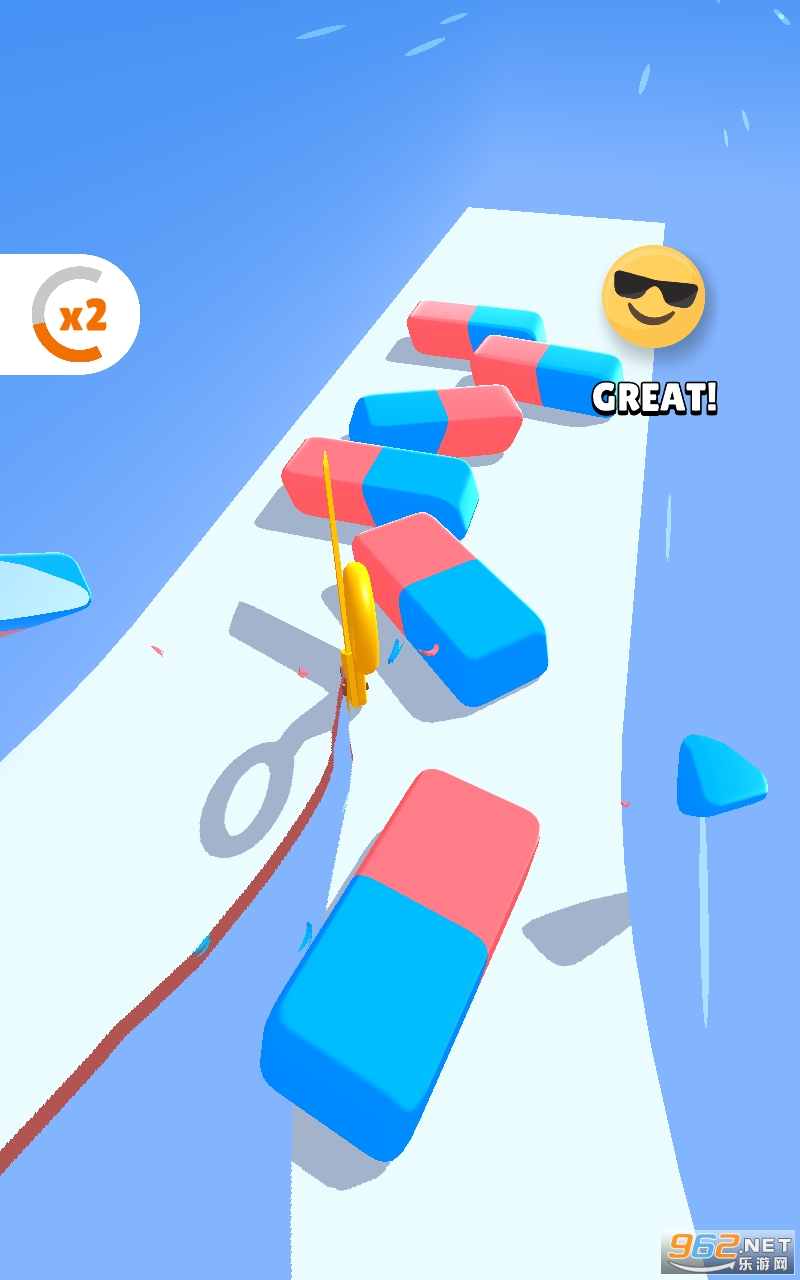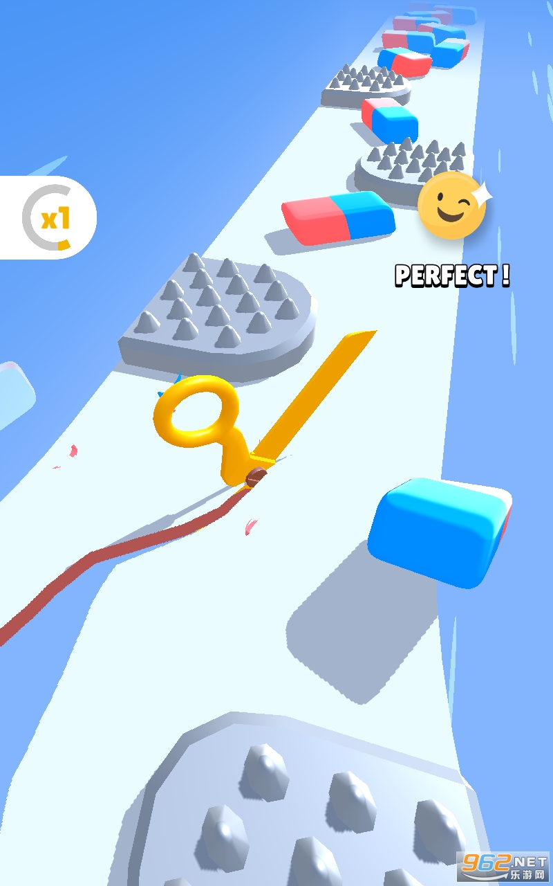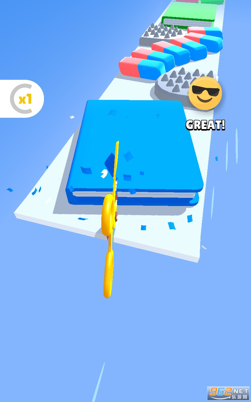 3、小清新卡通场景与您一起体验超有趣的跑酷挑战,滑动剪刀冲刺冒险,一路释放剪刀剪碎障碍。