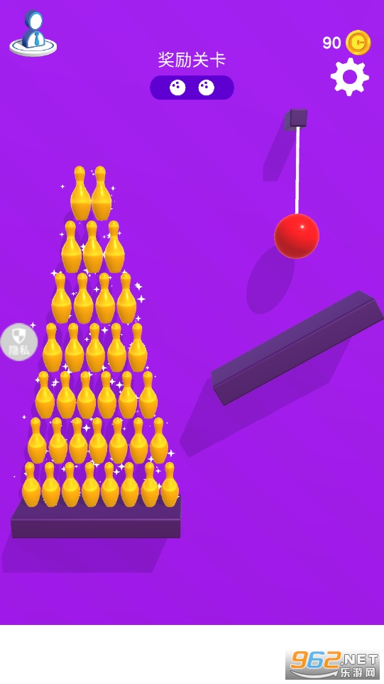 3、剪断绳子,让保龄球将所有保龄球钉子撞到地面,然后击落所有保龄球钉子以完成任务。