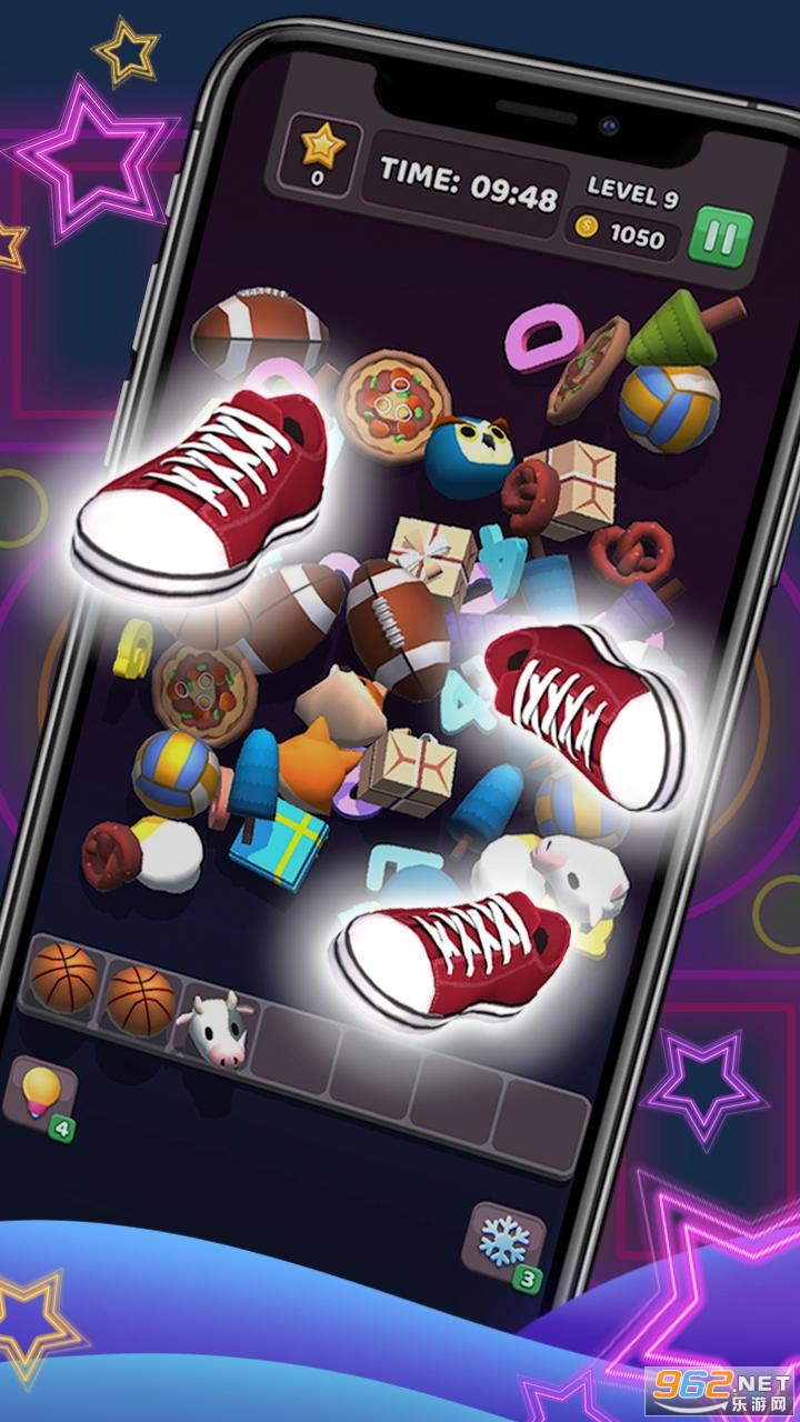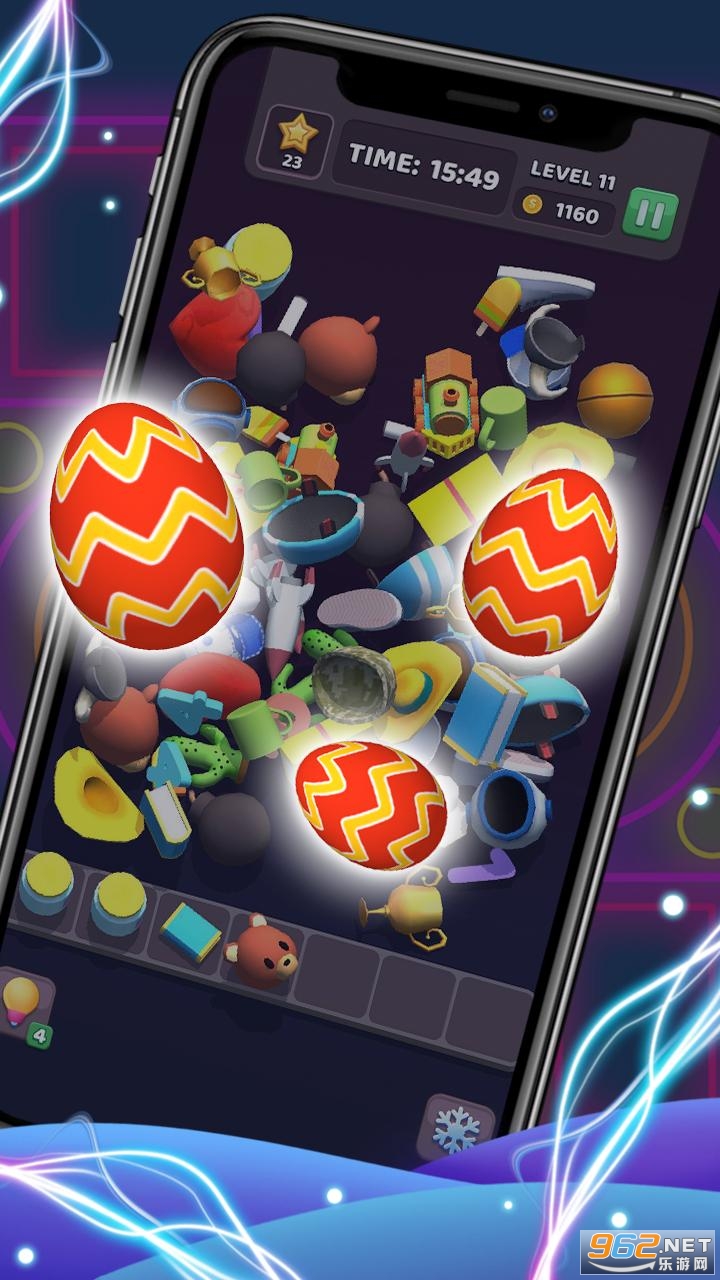 从随机放置的物品中选择三个相同的3d项目!小心一点,不要填满收集栏!