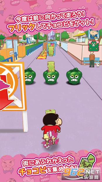 这是一场跑步游戏,其中在春日部市冲刺的Shin-chan上下,左右操作,以获取她喜欢的各种巧克力和巧克力,同时避免各种障碍。