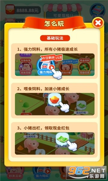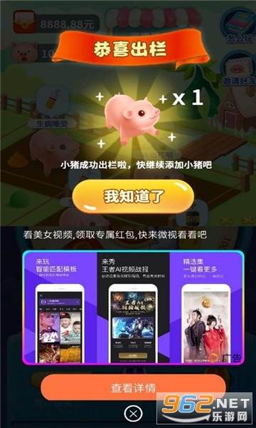 《爱上养猪提现版》是一款非常给力的养猪赚钱小游戏,不但可以打发无聊的时间,还能享受最好的赚钱体验,合成等级越高奖励越好,提现也方便,赚钱也轻松,喜欢来962下载试试吧!