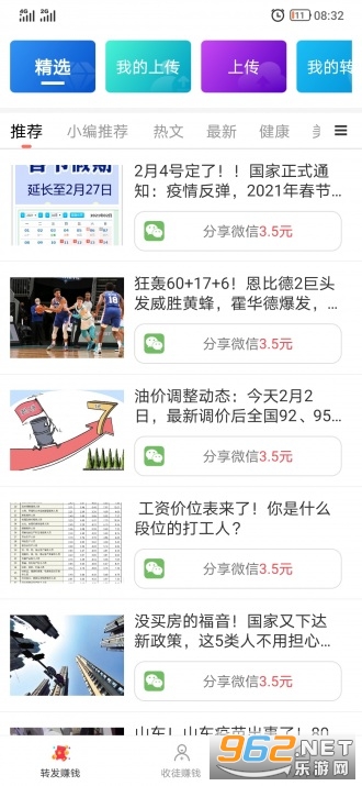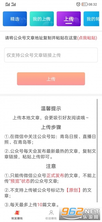 1、新用户首次转发送1元红包,转发分享文章单价1.5元,支持上传文章