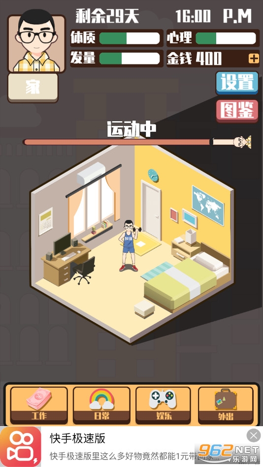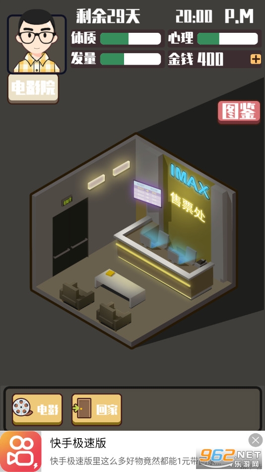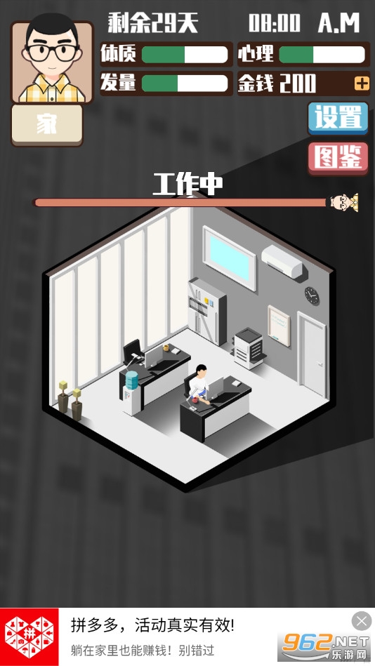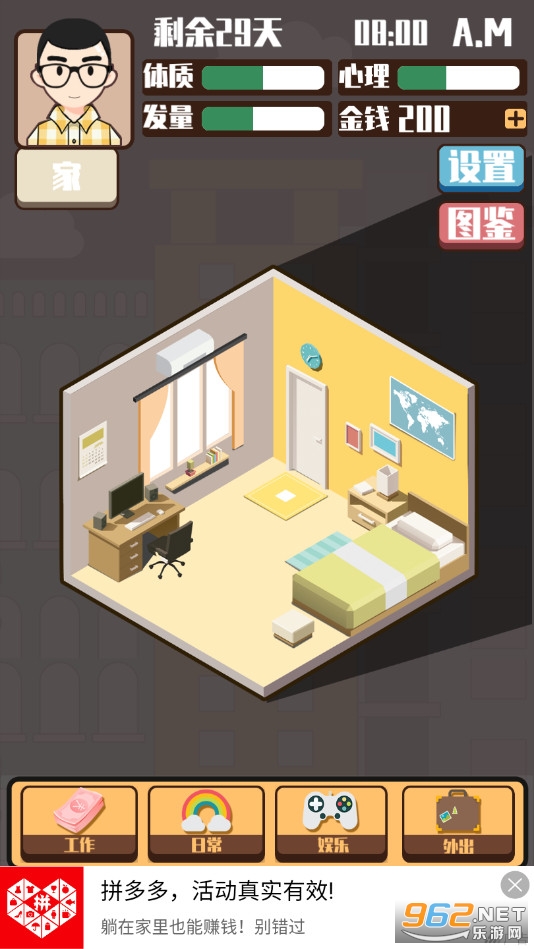 魔性休闲游戏,玩家可以选择多种不同的方式去玩耍,比如打工、看电影、逛商城等等,注意观察角色的体质、心里、发量等数值,游戏测试中有着一些广告,不过对操作影响不大,喜欢的朋友可以下载试试。