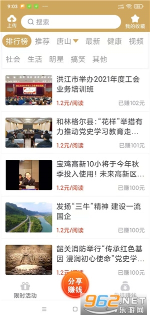 2、登录成功后,点击“分享赚钱”任意选择一篇文章转发到群或者朋友圈,有人点击阅读你就有现金奖励