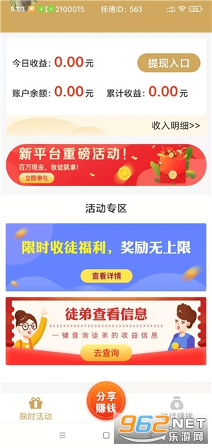3、白虎网转发平台新上线期间有重磅活动撒百万现金,徒弟转发每满10元奖励师傅5元,活动奖金在活动页领取