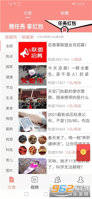 2、登录成功后,点击“视频”或者“文章”频道转发任意文章或者视频到,被阅读后就有现金奖励