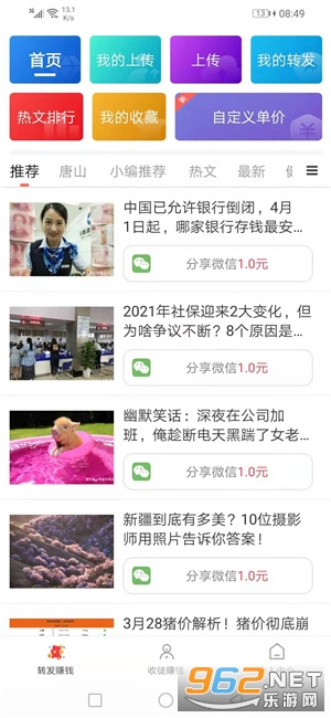 2、登录成功后,点击“转发赚钱”或“小视频”选择感兴趣的文章/视频转发到,被阅读即可获得相对应的现金收益
