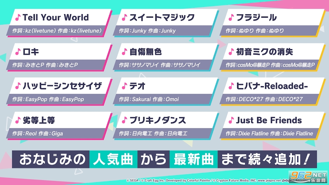 1.游戏乐曲方面,官方暂时公佈了「Just Be Friends」与「スイートマジック」等六首,以及邀请到「DECO*27」、「ピノキァ≡ー」等创作者参与乐曲製作,游戏其中一首主题曲就由「Giga」与「Mitchie M」共同製作.