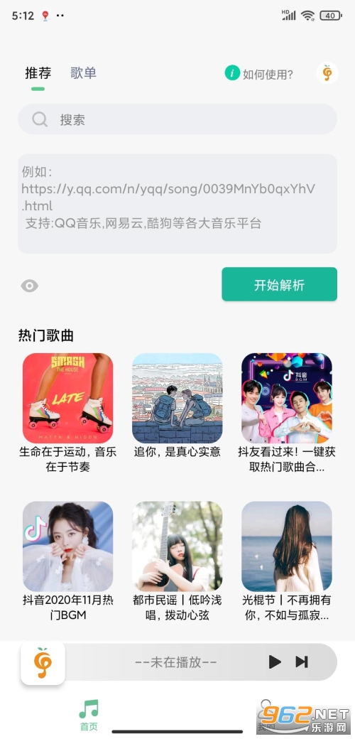 4、打开小橘音乐搜索你喜欢的音乐即可,在首页歌单里面可以查看你喜欢听的歌曲。