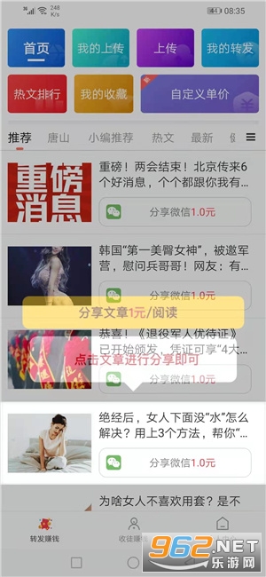 2、登录成功后,点击“转发赚钱”或“小视频”选择感兴趣的文章/视频转发到,被阅读即可获得相对应的转发酬劳