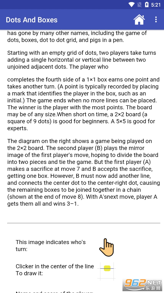 《圆点和方框游戏》是一款休闲益智类单机手游,玩家需要跟电脑进行一关接一关的挑战,游戏难度适中,画风十分简约,上手难度低但是想打赢电脑还是要费很大一番功夫的,推荐给喜欢点线相连游戏的小伙伴,喜欢就快来下载吧。