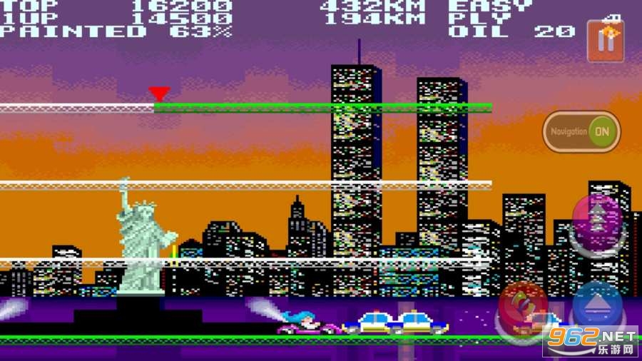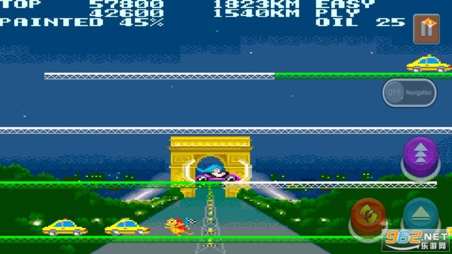 这是一款经典的街机游戏,通过在所有12个关卡(纽约,伦敦,法国,德国,荷兰,埃及,印度,中国,日本,澳大利亚,拉丁美洲和美国的纪念碑谷)避开障碍物为白色道路着色世界各国的主题。