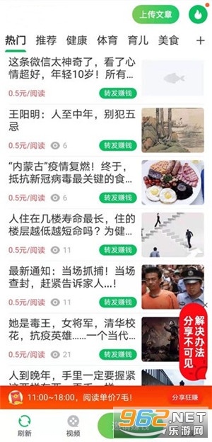 2、登录成功后,点击“转发赚钱”或者“视频”页面任选一篇文章/视频转发到,被有效阅读后即可获得奖励