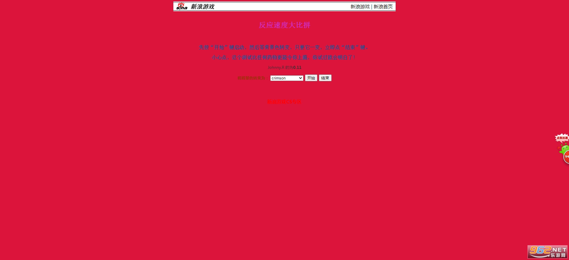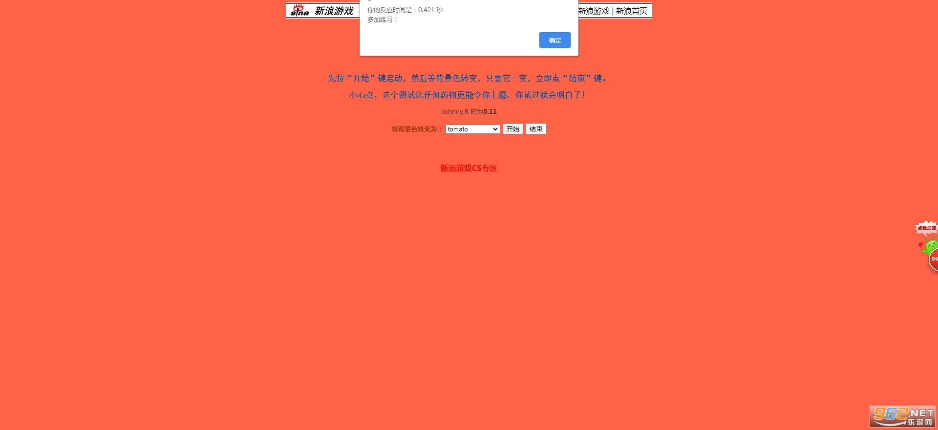 《Extreme Test 反应速度测试》是一款测试反应速度的游戏,由新浪推出,玩法操作比较简单,玩家们进入游戏之后选择开始即可接受挑战,根据游戏中的要求,快速完成任务,在简单的操作里面测试自己的反应速度,锻炼你的反应能力,感兴趣就来试试吧!