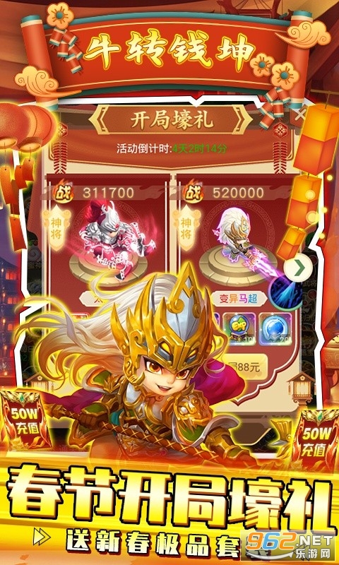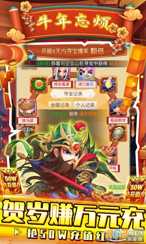 4、充值奖池50W红包,挑战成功即可瓜分;开局壕礼最高领武圣关羽