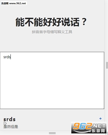 《缩写翻译器能不能好好说话》是00后网络用语黑话缩写翻译器,专为喜欢拼音缩写的小伙伴打造的,现在越来越多的朋友在聊天的过程中喜欢使用拼音缩写了,但是有时候缩写的太长了或者不常见的话,很多朋友就不知道说的是啥,缩写翻译器能不能好好说话能够为你直接翻译出各种拼音缩写,网络黑话,让你轻松理解,需要就来下载吧!