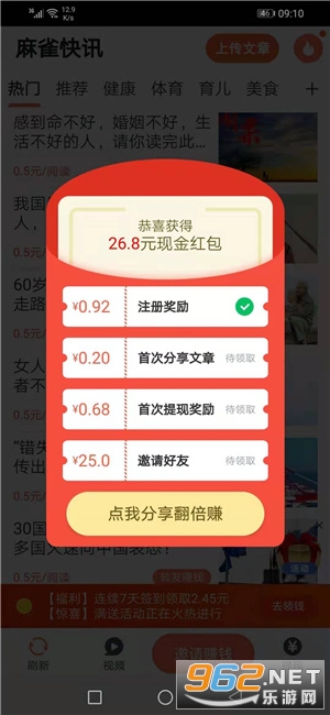 1、新用户下载注册麻雀快讯app就送0.92元,转发文章单价5-7毛(上线第三天全天提价至0.7元)