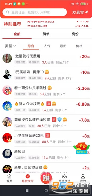 2、悬赏大厅海量任务任你选择,按要求完成即可获得相应的奖励,任务单价一般在1-10元左右