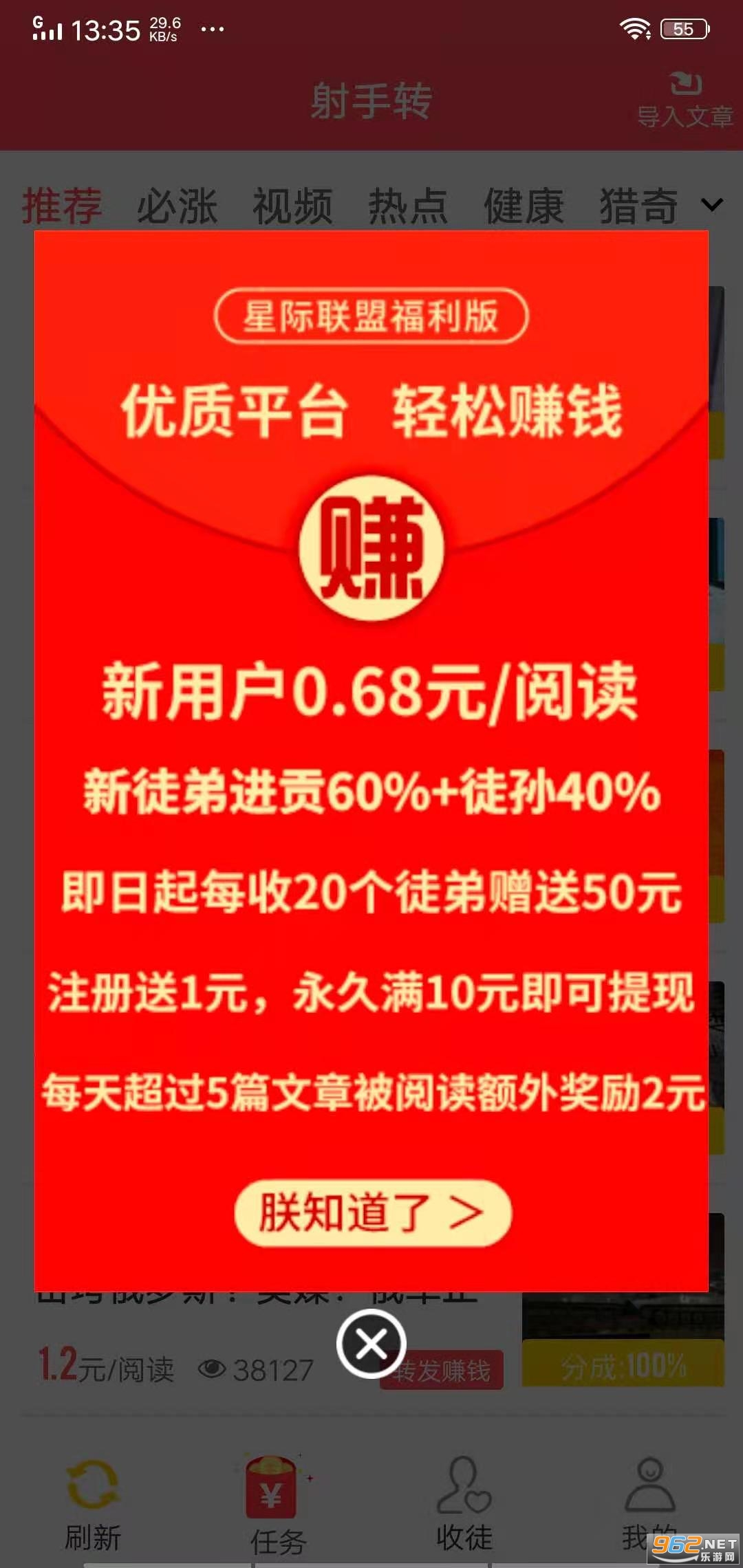 射手转APP(星际联盟)旗下在2026年4月2日隆重上线的转发文章赚钱软件!新人下载安装射手转送1元现金红包,软件上每天更新上千篇优质新闻资讯,转发分享至,好友点击阅读就能挣现金,大公司旗下稳定可靠,长期可做!