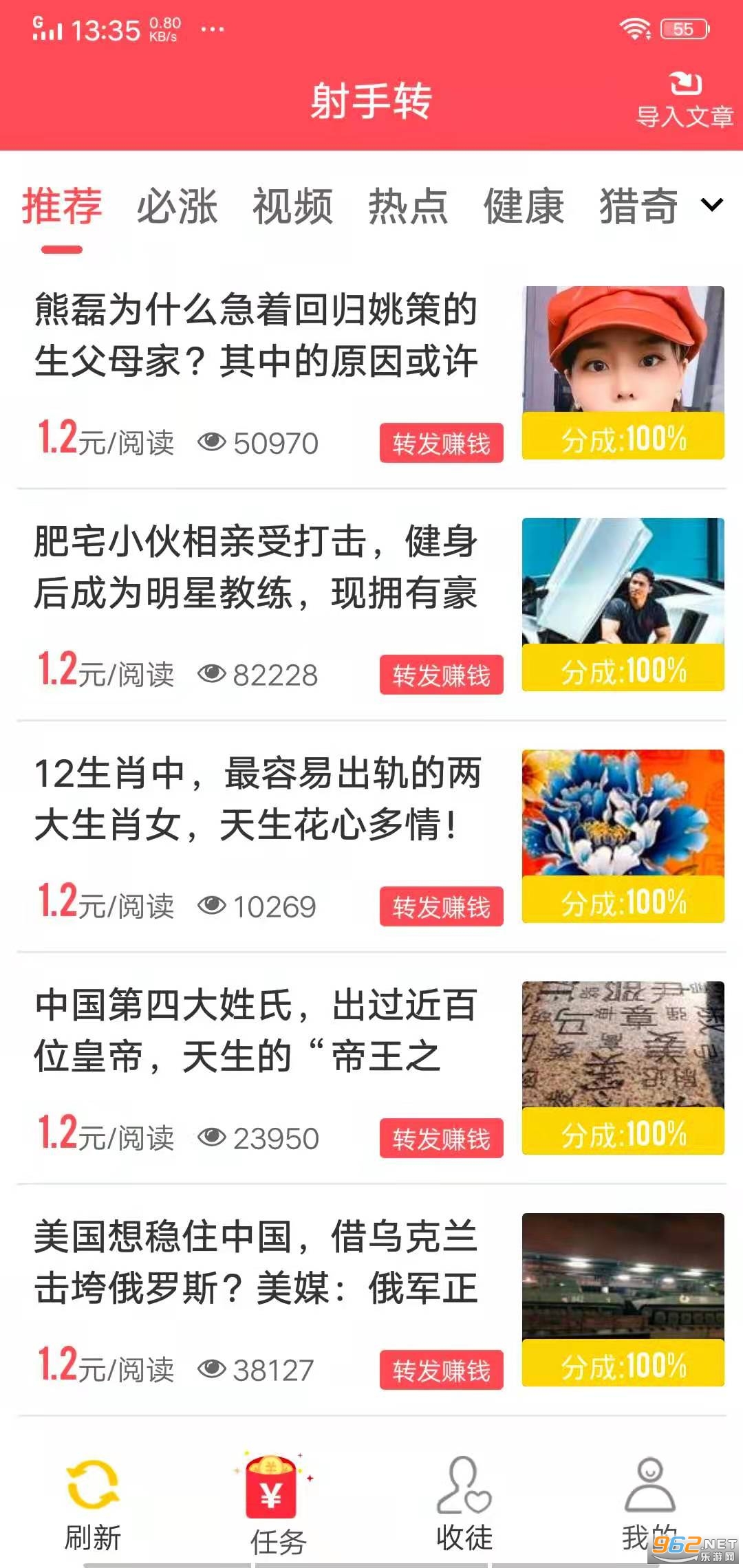 2、软件上提供了新闻、搞笑、美食、娱乐、健康等文章,转发至,好友点击就能挣钱;