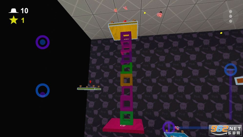 尾迹模式,可以在三维空间中自由绘画。通过射击其他戴着有颜色帽子的小飞猪可以改变尾迹的颜色。