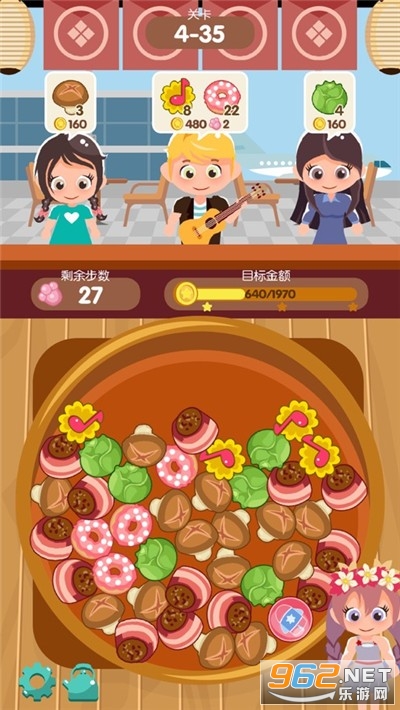 游戏中您拥有一家火锅店,客人纷纷前来光临,您需要满足客人的需求,在火锅中找到客人需求的食物然后拖动手指连接3个以上的相同食物即可完成一次消除,完成客人的需求获得金币,并升级您的店铺和技能,使您经营的店铺日益壮大。