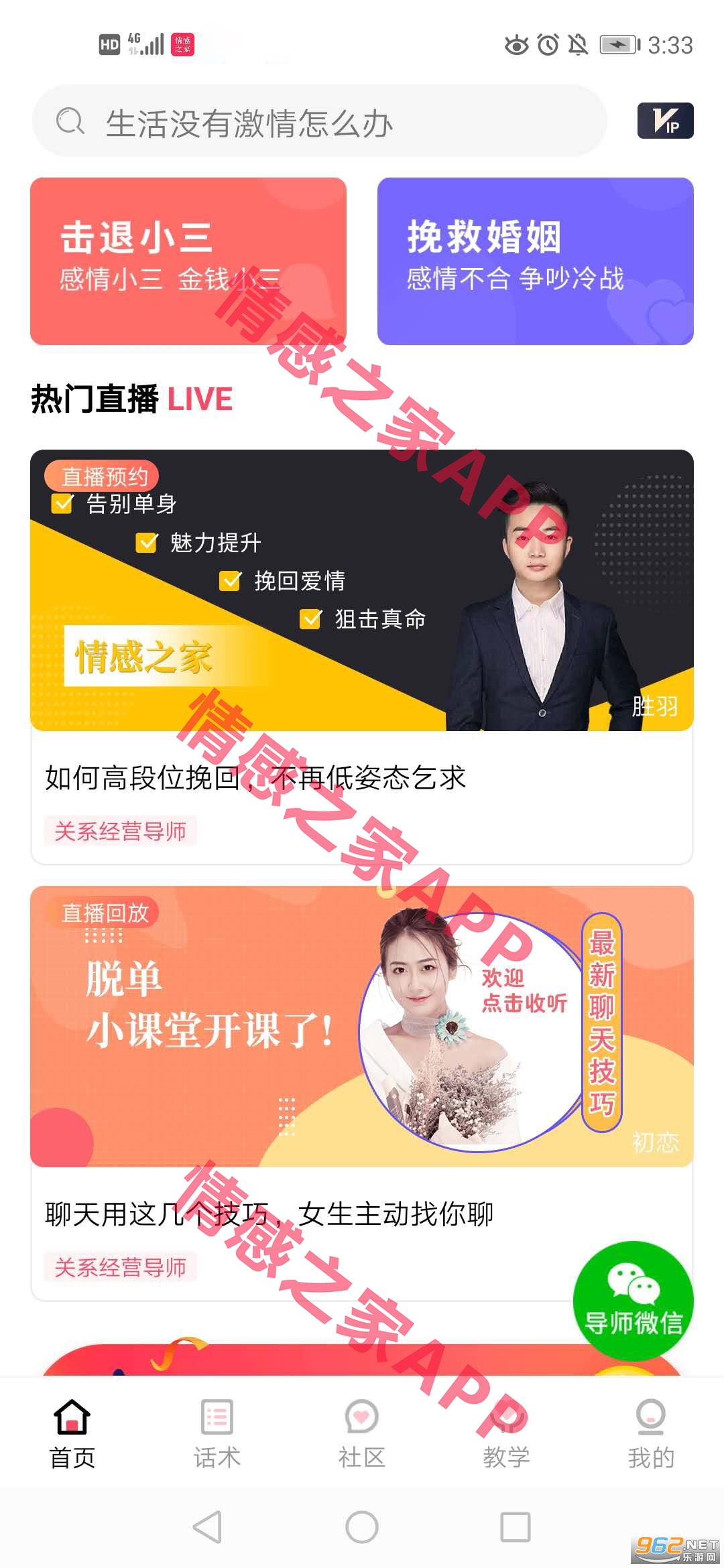 一个具有直播脱单挽回技巧教学、恋爱话术大数据、社区交流、专业导师一对一咨询的情感服务APP。直播脱单挽回技巧教学--每天会有不同老师分时段直播,各种干货技巧讲解,还可以在直播间向老师提问题,老师会针对性的分析讲解;