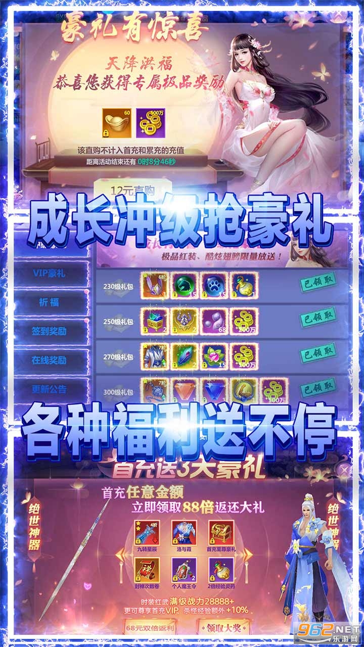 2、上线福利:VIP15、VIP15特权、元宝8888888,银币8888888