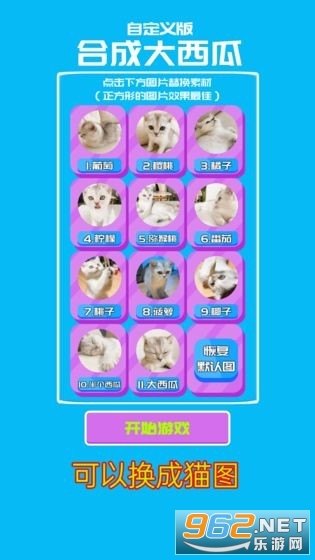 1、将各个水果进行替换,替换成为萌萌的猫吧,这些猫等你来合成哦。
