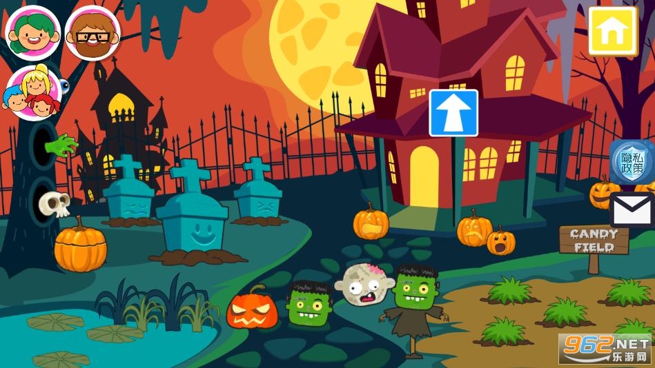 3、看看鬼屋的前面,点击不同的墓碑,生长糖果的花朵,怪物面具,蝙蝠,以及怪异的手,骷髅和眼睛!点击南瓜,看他们的脸变化!