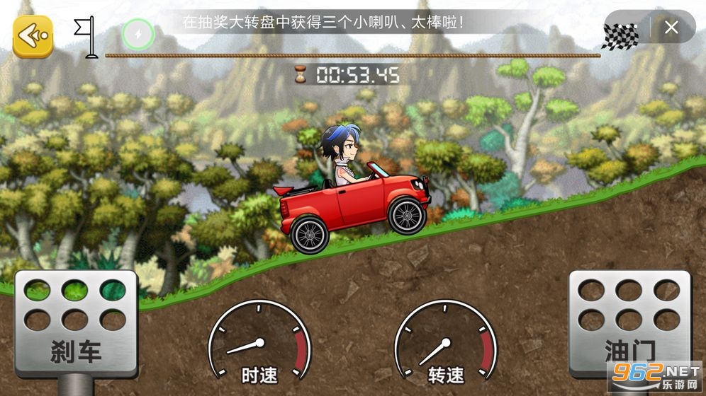 玩家需要驾驶一款赛车跑在山地上,由于山地非常颠簸,需要玩家很好的把握油门和刹车,保证车子就不会翻过来。