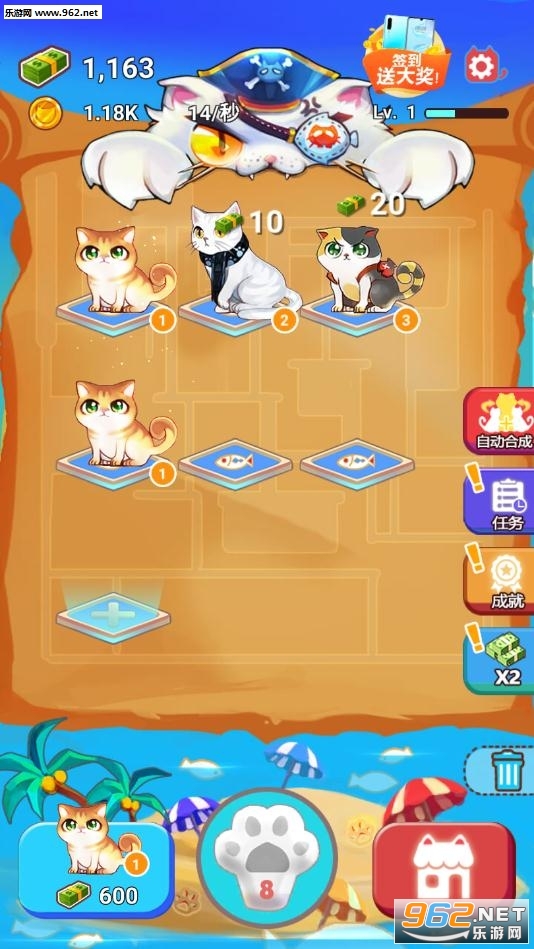 2、解锁新的喵喵就可以为你招财,轻轻松松的点点点,就可以完成合成升级。