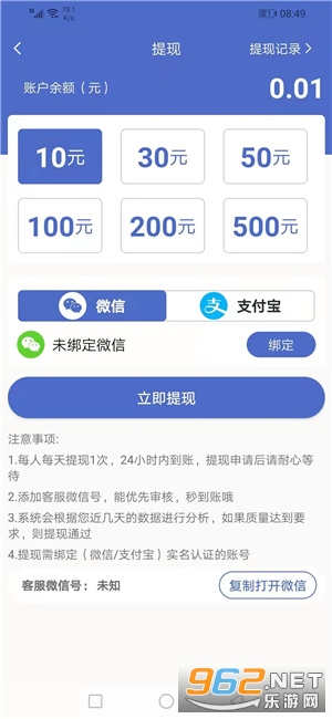 3、米转旗下蓝莓转永久满10元起提现到/支付宝,每人每天限提现一次,24小时内到账