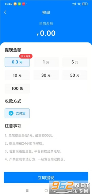 3、今日有钱新人专享0.3元提现到支付宝,之后最低1元起提现,24小时内审核到账