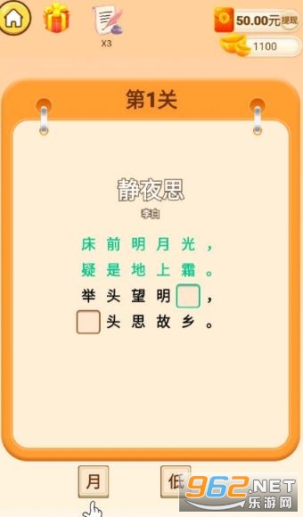 一款猜诗词的益智类游戏,可以巩固我们的知识,并在闯关的同时可以获得红包;非常适合所有人来猜题领奖,而且还给大家带来了非常魔性的玩法趣味;每天坚持玩几关,也能提升大家对诗词的印象,让自己的知识阅历越来越丰厚。