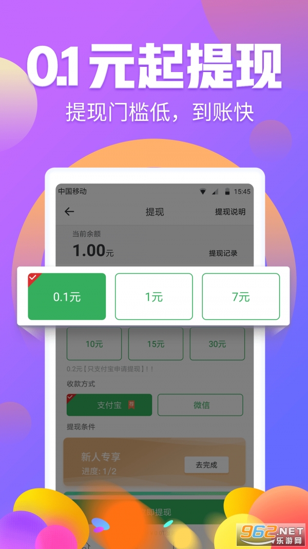 5. 快速提现,选择金额数据和提现方式,快速提现到账;