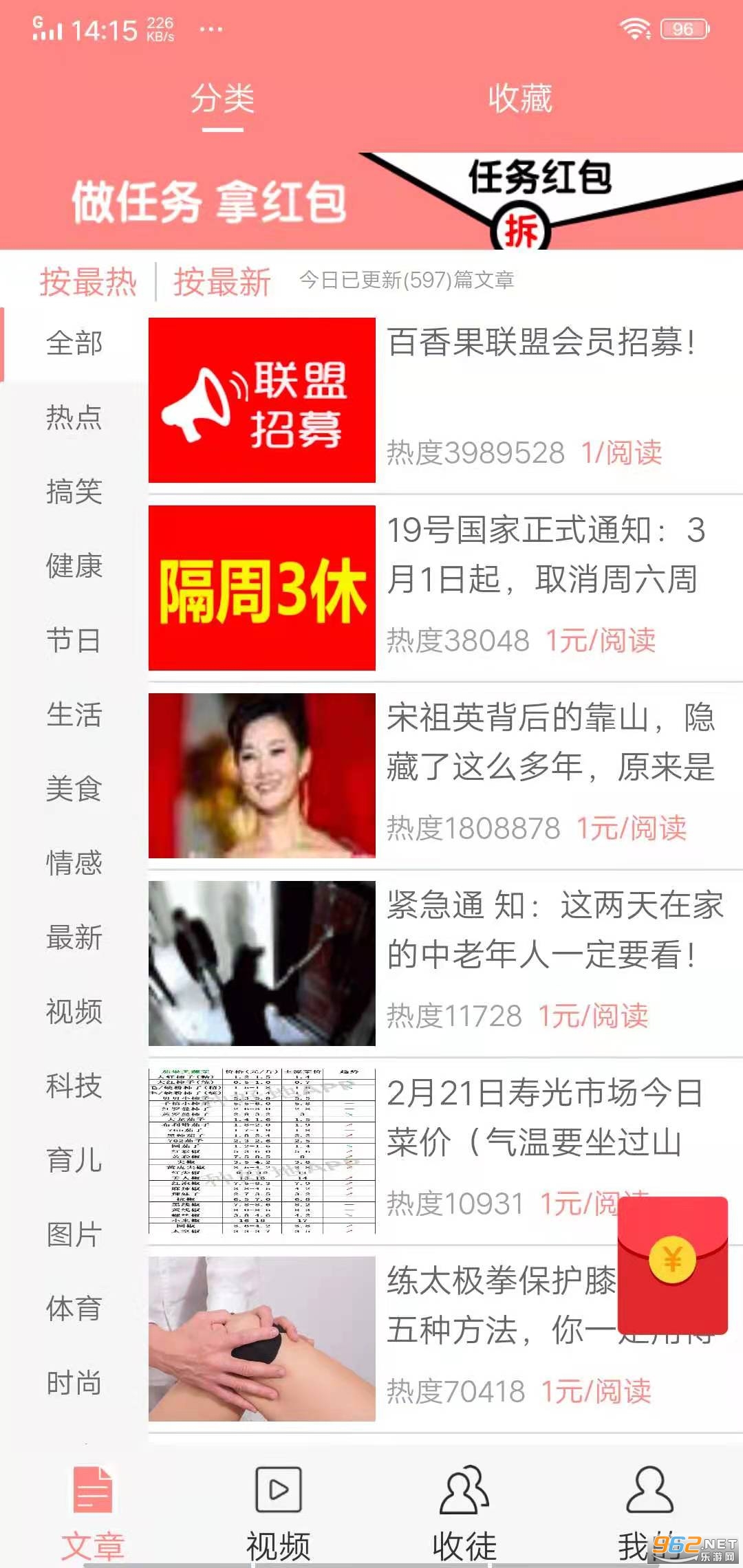 2、软件涵盖了美食、健康、科技、搞笑、娱乐等文章,转发至,好友点击阅读,坐享收益;