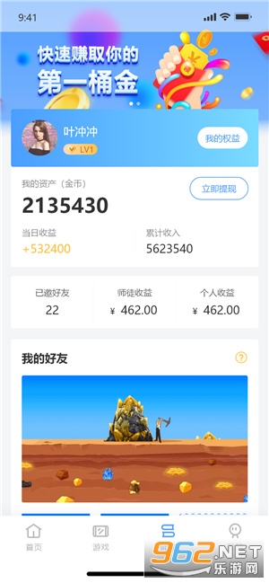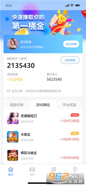 首页:用户可以在这个页面查看自己的资产情况,首页还展示了APP推荐的高额任务、游戏赚钱、平台奖励,三种任务信息。
